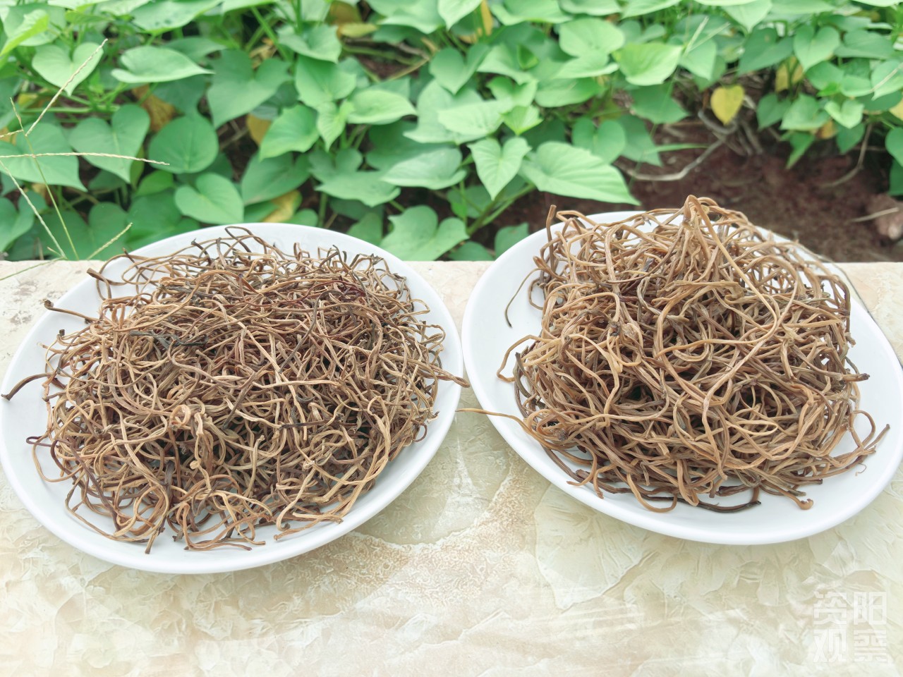 新鮮紅薯葉柄和紅薯葉干菜對比。