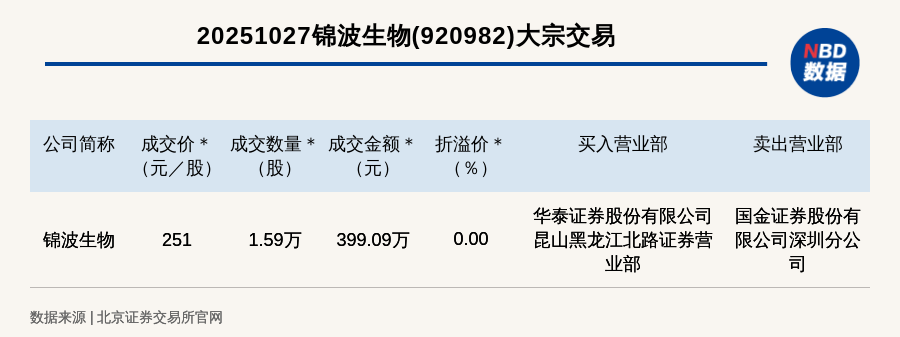 每經(jīng)訊,2025年10月27日,北交所上市公司錦波生物(920982,收盤(pán)價(jià):251元)發(fā)生一筆大宗交易,成交價(jià)251元/股,成交數(shù)量1.59萬(wàn)股,成交金額399.09萬(wàn)元,為平價(jià)交易。買入營(yíng)業(yè)部是華泰證券股份有限公司昆山黑龍江北路證券營(yíng)業(yè)部,賣出營(yíng)業(yè)部是國(guó)金證券股份有限公司深圳分公司。