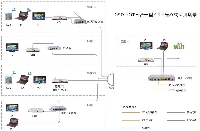 GSD-HOT 三合一型 FTTH 光終端是一款內(nèi)置了 CATV 及 ONU 光模塊和同軸電纜調(diào)制解調(diào)模塊的無(wú)源光網(wǎng)絡(luò)終端。該產(chǎn)品基于成熟穩(wěn)定的 EPON 技術(shù),并融合了千兆以太網(wǎng)交換技術(shù)和同軸電纜網(wǎng) EoC 技術(shù),不僅系統(tǒng) 可靠性高,而且組網(wǎng)部署方便,為 FTTH 網(wǎng)絡(luò)光纖入戶后駁接室內(nèi)原有的同軸電纜網(wǎng)絡(luò)提供了一個(gè)便捷的 解決方案,使原有的 EOC 網(wǎng)絡(luò)設(shè)備(包括 EOC 終端和內(nèi)置 EOC 模塊的雙向機(jī)頂盒)在不做任何改動(dòng)的 情況下,就能方便地接入新建的 FTTH 網(wǎng)絡(luò),并能同時(shí)支持寬帶上網(wǎng)和 VOD 點(diǎn)播等多個(gè)業(yè)務(wù)。